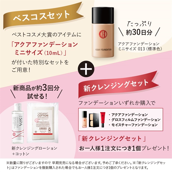 \BEST COSMETICS AWARDS 2025 受賞/ 数々の美容誌でも話題のリクイッドファンデーション。 内側から発光するかのような光の反射率と、カバー力、密着力、透明感*が魅力です。 ベースメイク部門で「1位」を受賞♪ 今なら受賞商品には「アクアファンデーション ミニサイズ(10mL)」をセットでお届けいたします! さらにファンデーションをご購入で新商品「クレンジングローション ミニサイズ(30mL)」もおひとつプレゼント。 特別セットは12/25(木)までの期間限定です。 この機会をお見逃しなく。 レビューを見る・書く