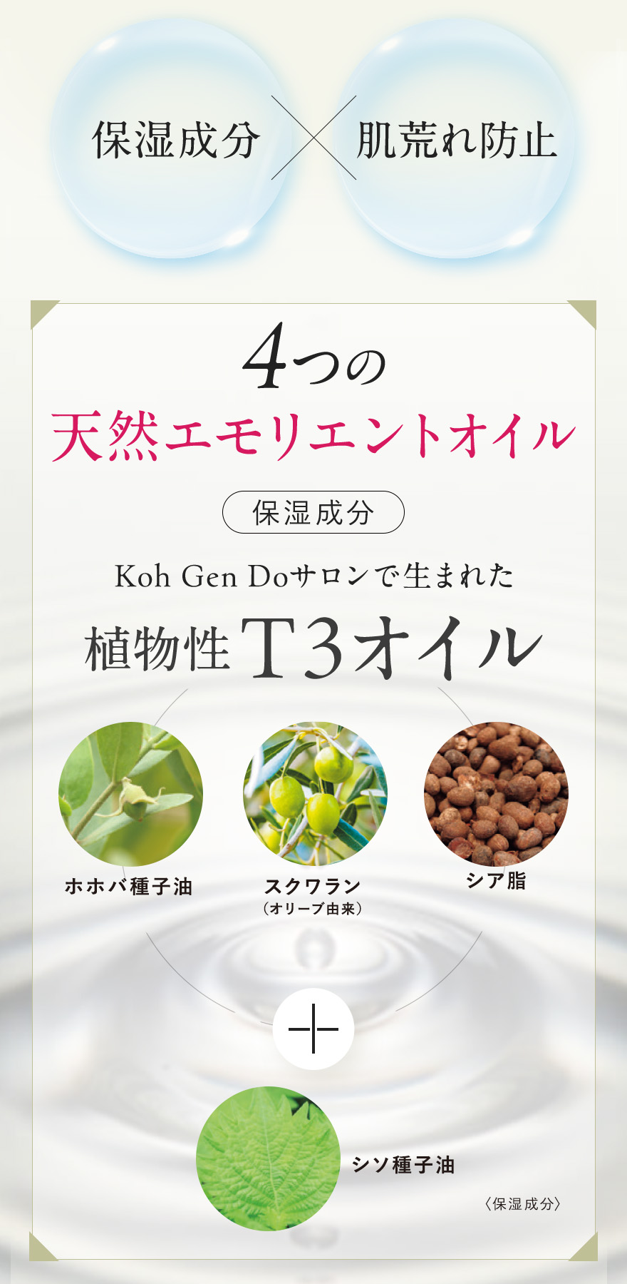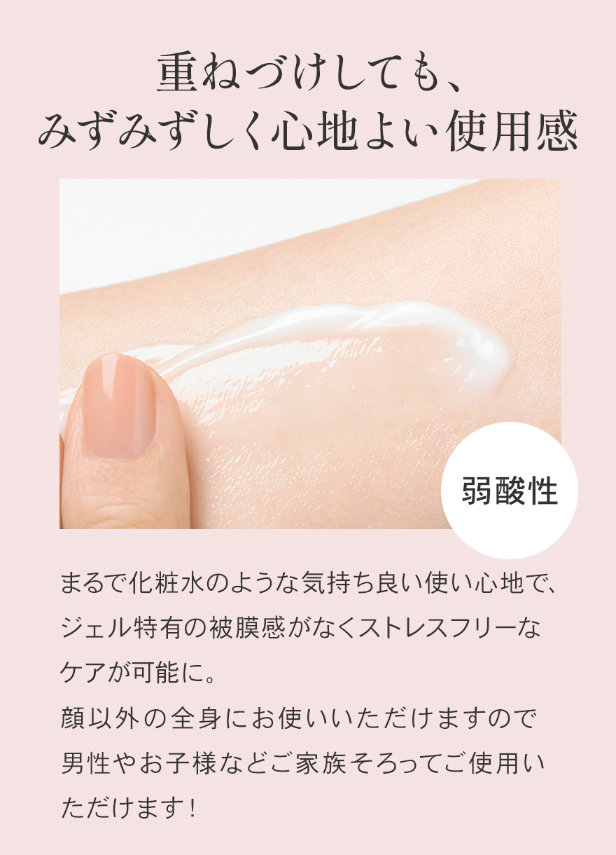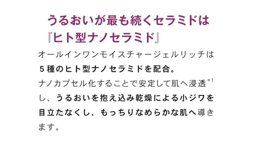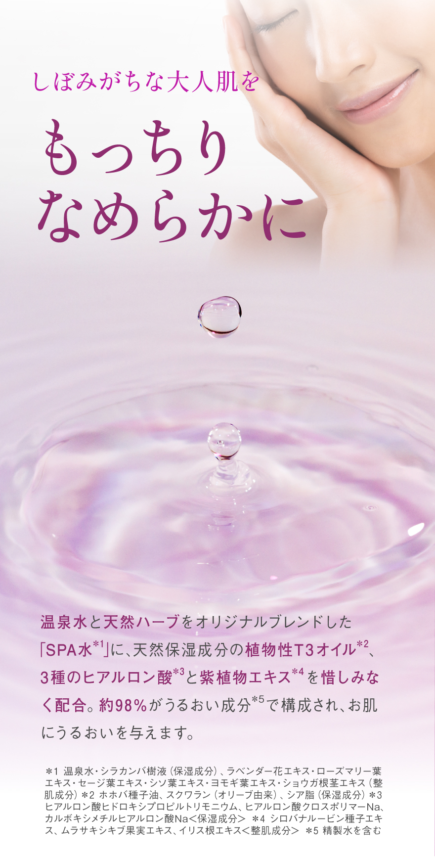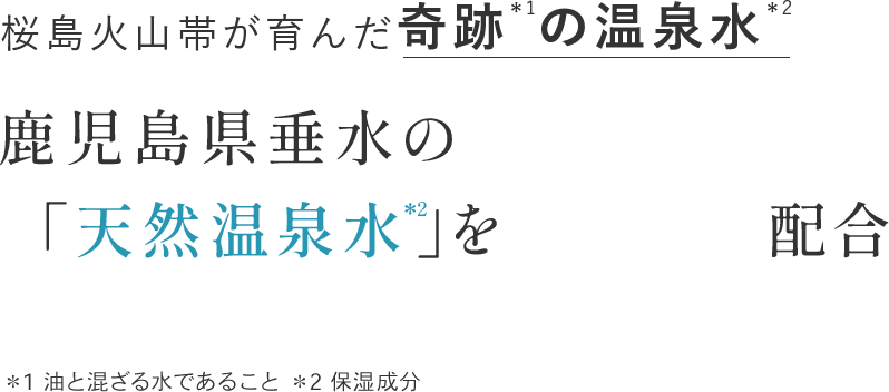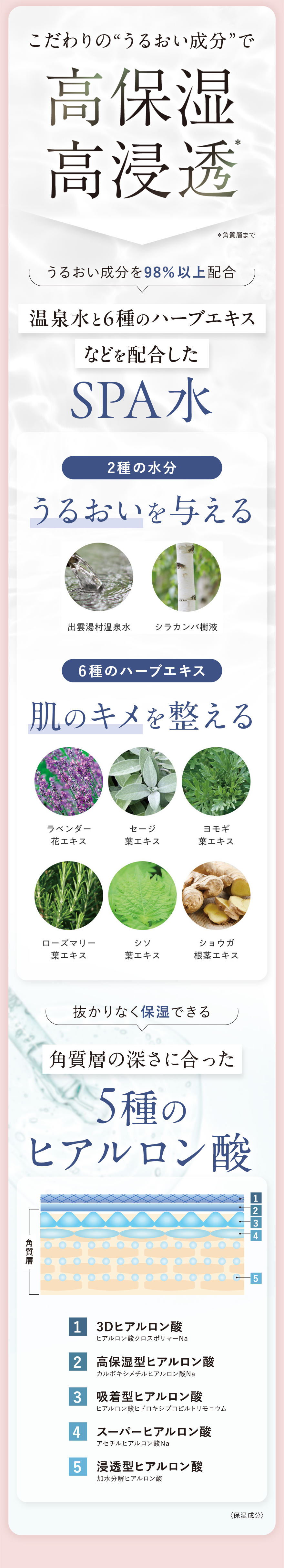 *1 角質層まで *2 温泉水、シラカンバ樹液〈保湿成分〉、ラベンダー花エキス、ローズマリー葉エキス、セージ葉エキス、シソ葉エキス、ヨモギ葉エキス、ショウガ根茎エキス〈整肌成分〉*3 整肌成分 *4 ヒアルロン酸ヒドロキシプロピルトリモニウム、ヒアルロン酸クロスポリマーNa、カルボキシメチルヒアルロン酸Na〈保湿成分〉*5 ホホバ種子油、スクワラン(オリーブ由来)、シア脂〈保湿成分〉*6 保湿・整肌成分