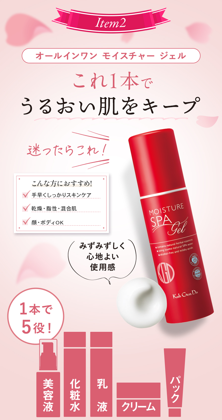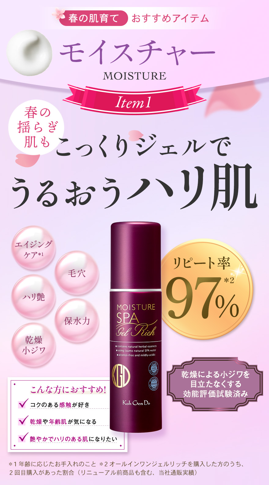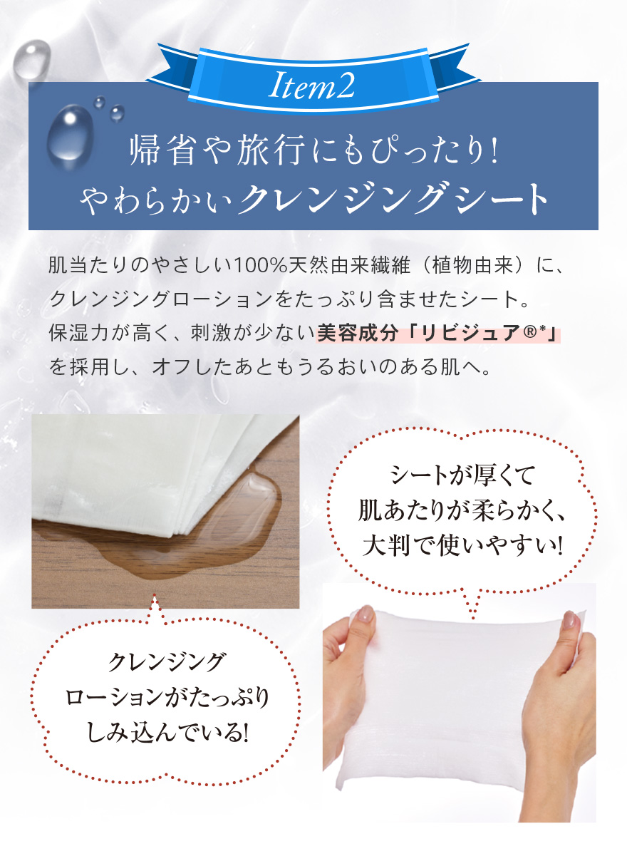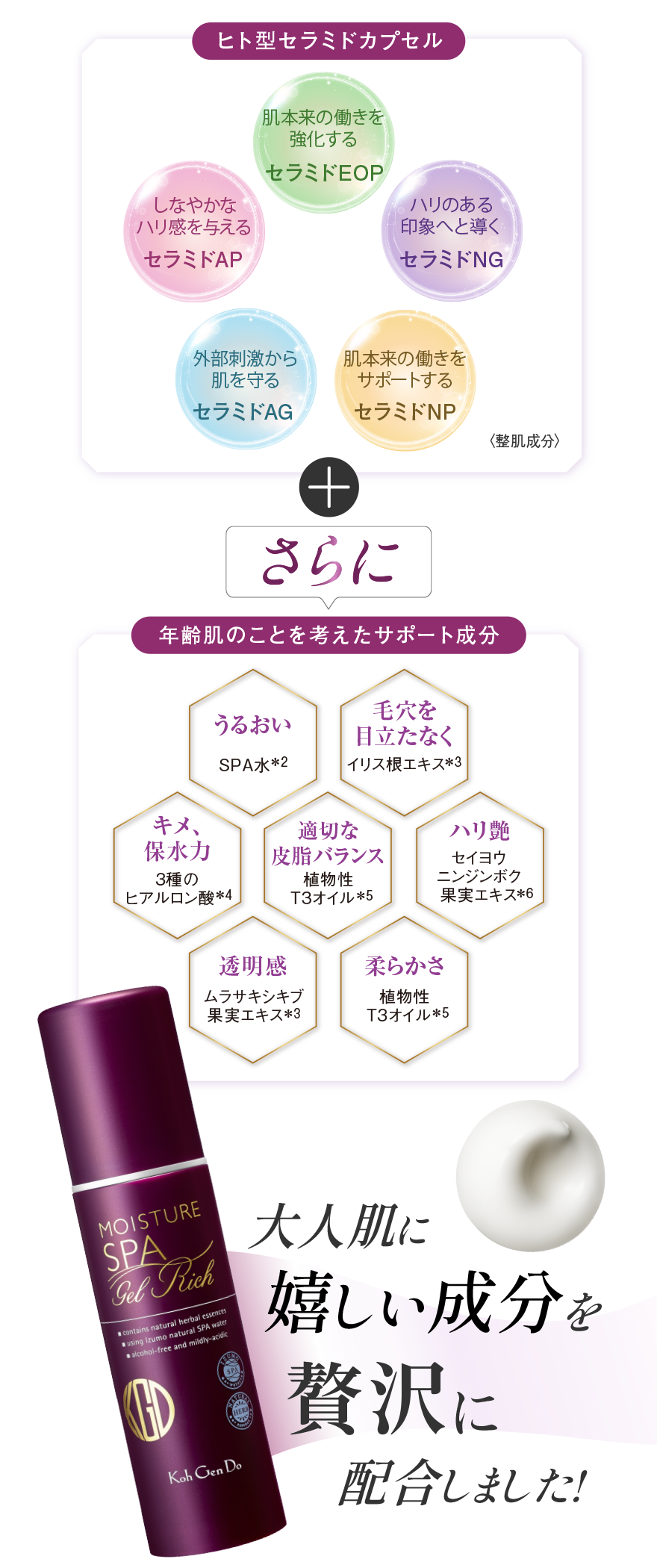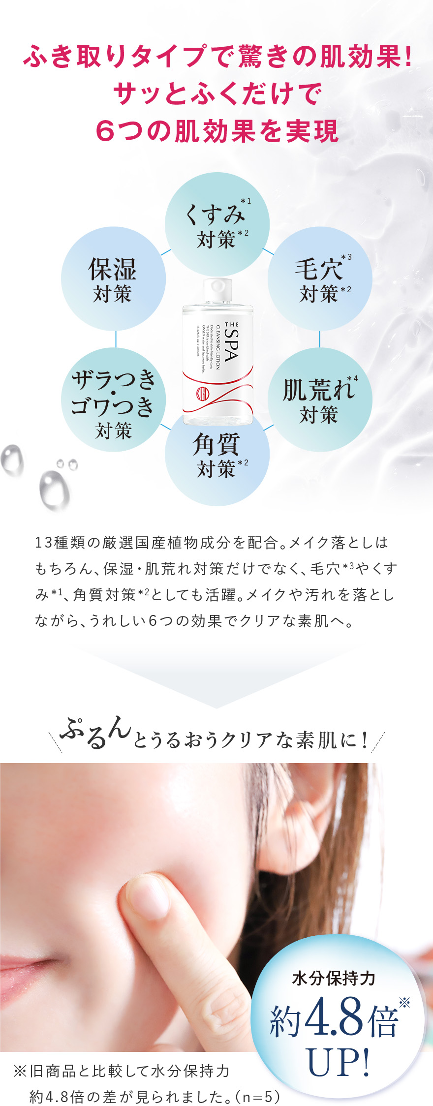 *1 角質層まで *2 温泉水、シラカンバ樹液〈保湿成分〉、ラベンダー花エキス、ローズマリー葉エキス、セージ葉エキス、シソ葉エキス、ヨモギ葉エキス、ショウガ根茎エキス〈整肌成分〉*3 整肌成分 *4 ヒアルロン酸ヒドロキシプロピルトリモニウム、ヒアルロン酸クロスポリマーNa、カルボキシメチルヒアルロン酸Na〈保湿成分〉*5 ホホバ種子油、スクワラン(オリーブ由来)、シア脂〈保湿成分〉*6 保湿・整肌成分