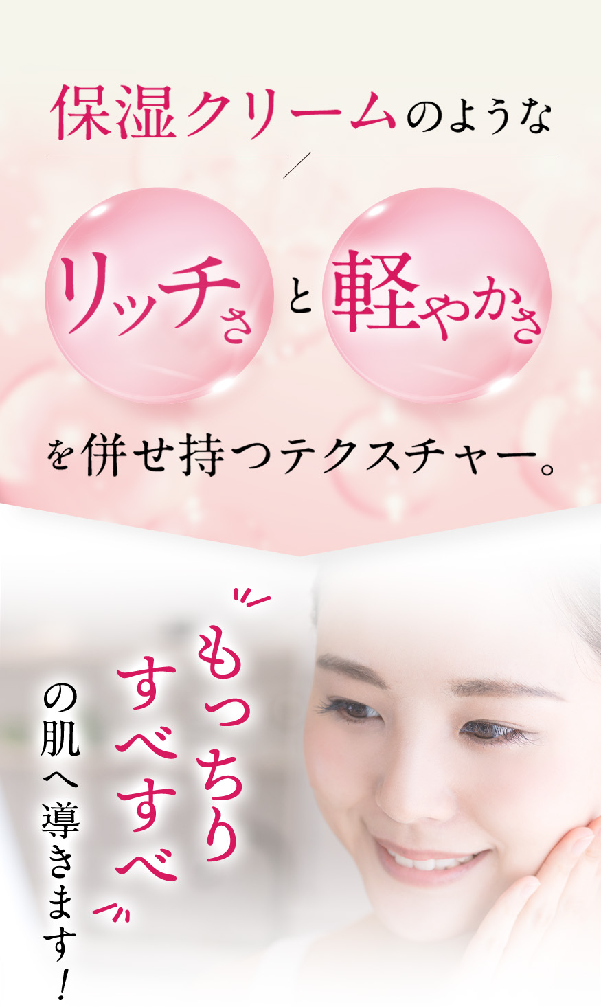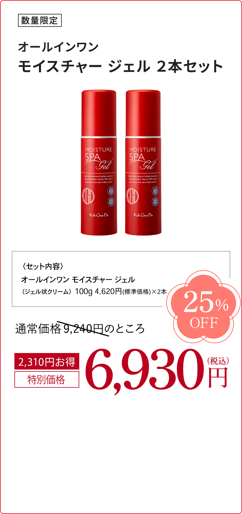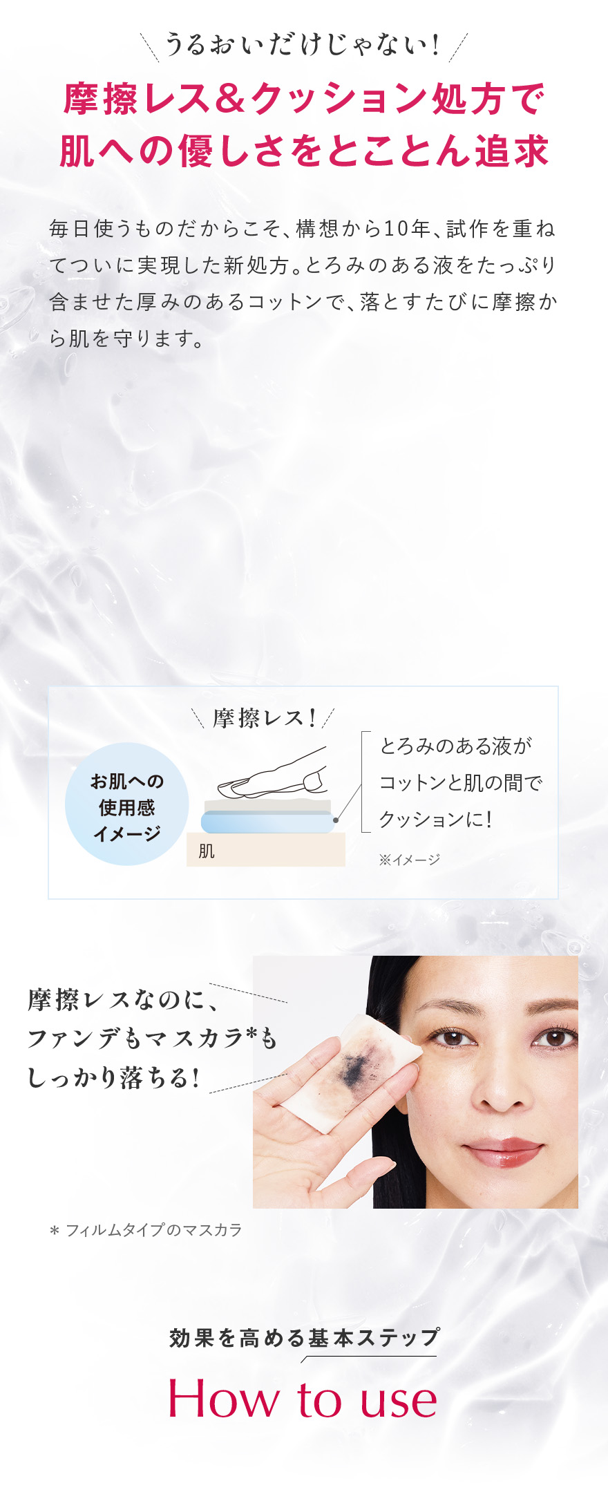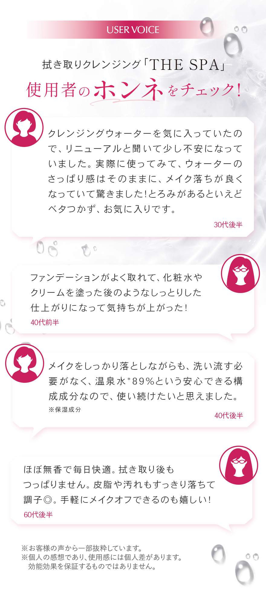*1 角質層まで *2 温泉水、シラカンバ樹液〈保湿成分〉、ラベンダー花エキス、ローズマリー葉エキス、セージ葉エキス、シソ葉エキス、ヨモギ葉エキス、ショウガ根茎エキス〈整肌成分〉*3 整肌成分 *4 ヒアルロン酸ヒドロキシプロピルトリモニウム、ヒアルロン酸クロスポリマーNa、カルボキシメチルヒアルロン酸Na〈保湿成分〉*5 ホホバ種子油、スクワラン(オリーブ由来)、シア脂〈保湿成分〉*6 保湿・整肌成分